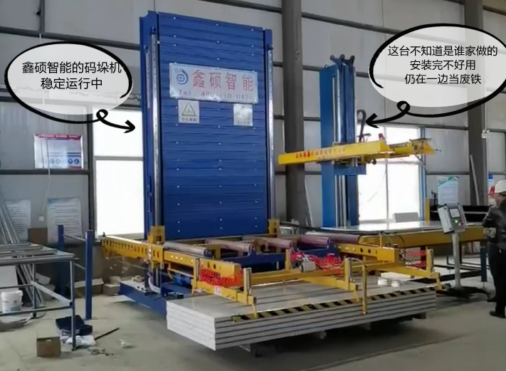 今日,山西客户新定的两台彩钢夹芯板码垛机顺利安装调试并投入生产使用。此前该客户于其他夹芯板码垛机厂家定制一台码垛机设备,安装之后始终问题不断导致客户无法正常使用,无奈之下只能仍在一边。然后于辽宁米兰MiLan(中国)机械,定制3台彩钢夹芯板码垛机器人。安装调试之后,一直稳定运行使用中。客户给予米兰MiLan(中国)高度认可。